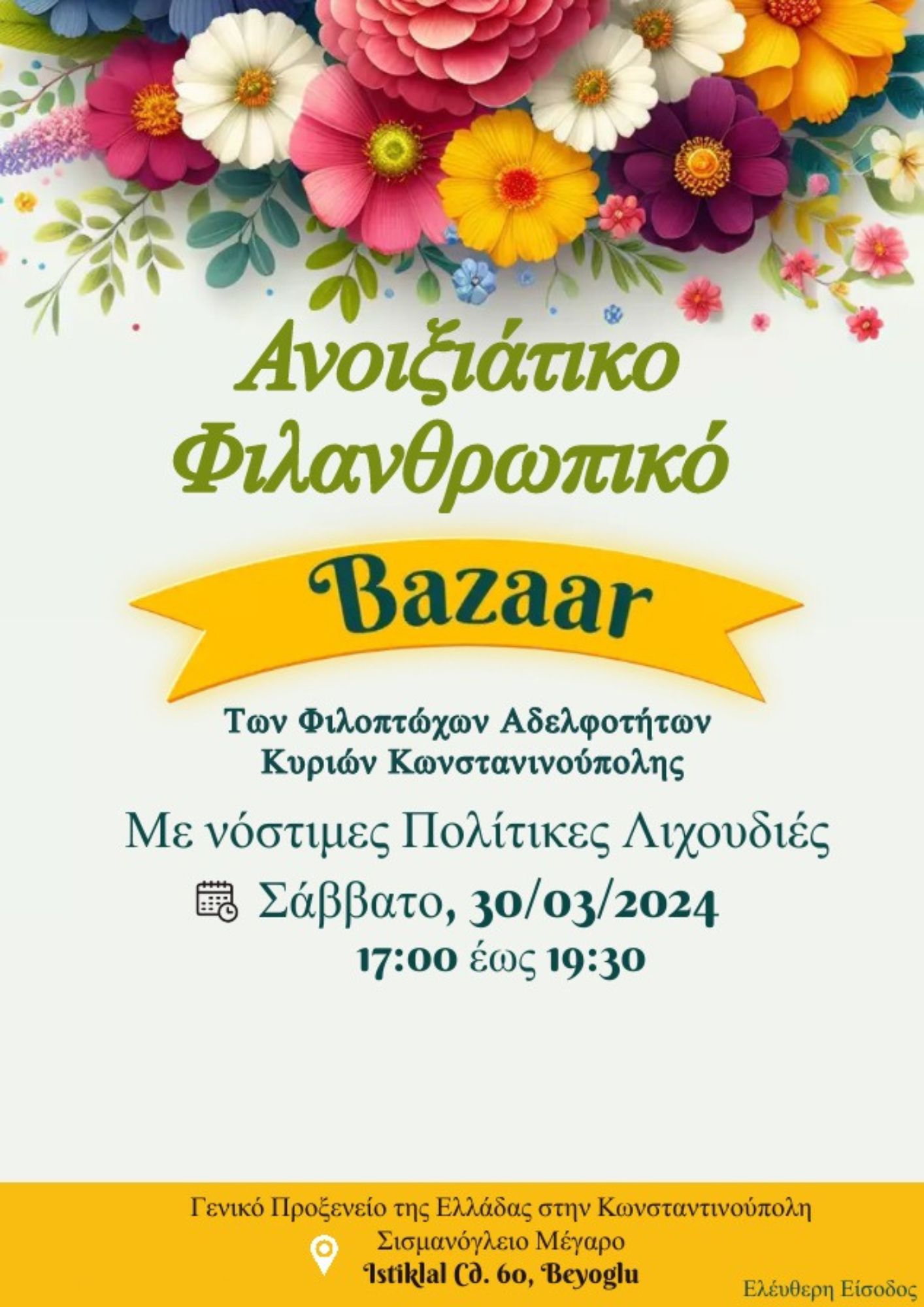 Σας προσκαλούμε στο Ανοιξιάτικο Φιλανθρωπικό Bazaar που θα πραγματοποιηθεί στο Σισμανόγλειο Μέγαρο στις 30 Μαρτίου 2024, με πρωτοβουλία της συζύγου του Γενικού Προξένου της Ελλάδας, κ. Ποπίτας Παύλη.